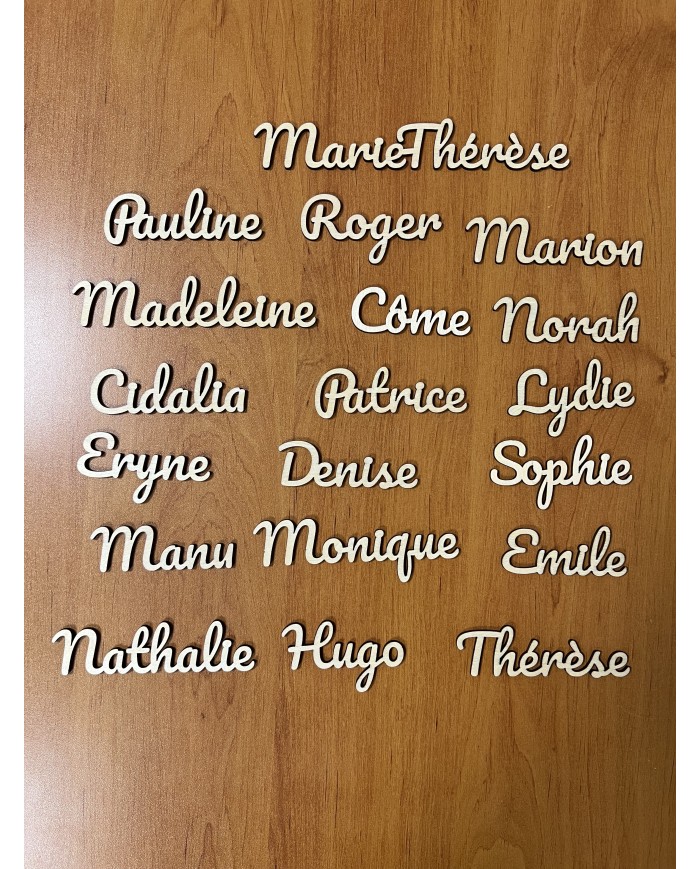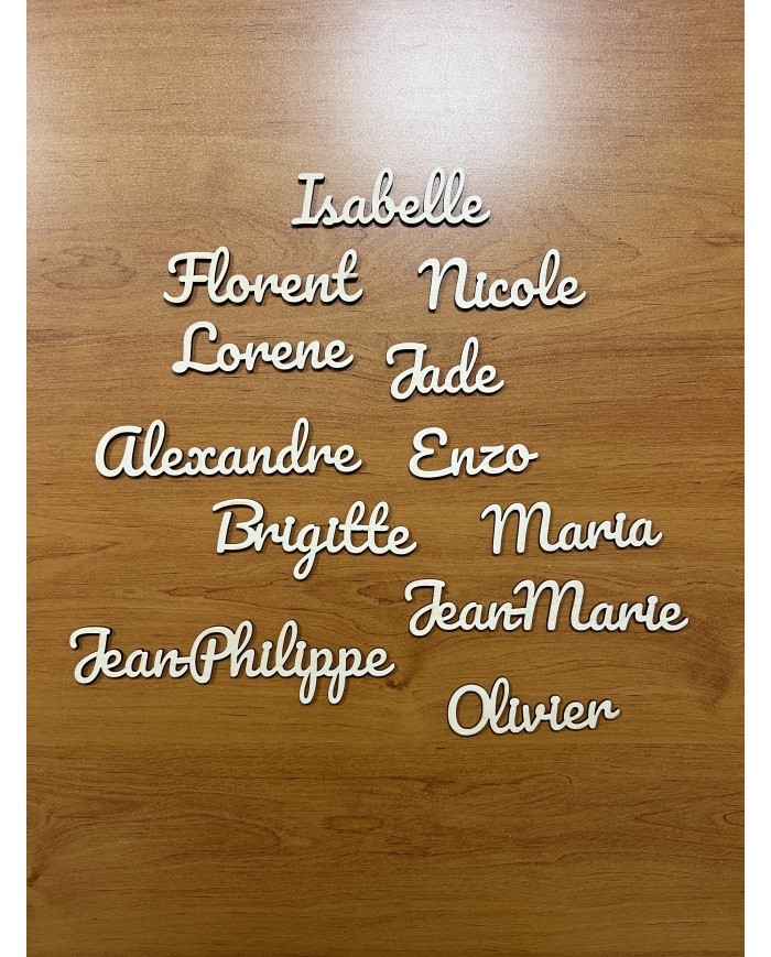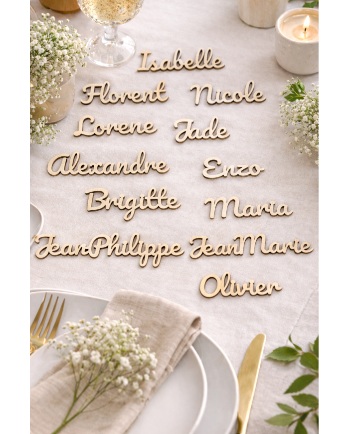 Chaque prénom est découpé avec précision dans du contreplaqué afin d’offrir un rendu soigné, élégant et parfaitement adapté à vos événements. En plus d’indiquer la place de chaque invité, il devient un véritable élément de décoration et un joli souvenir à conserver.